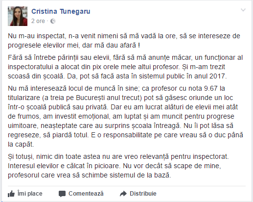 Cristina Tunegaru este profesoara din București ce a fost dată afară pentru că a contrazis-o public pe doamna Gabriela Firea, blonda ce se numește primarul general al capitalei.