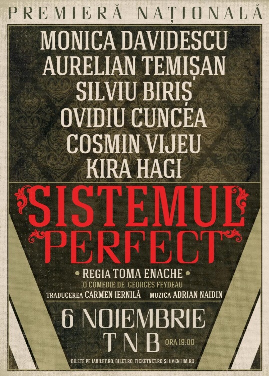 Piesa de teatru „Sistemul Perfect” va avea premiera națională pe data de 6 noiembrie, ora 19:00 la Teatrul Național din București. Bilete pe: iabilet.ro, bilet.ro, ticketnet.ro și la casa de bilete a Teatrului Național ( TNB).